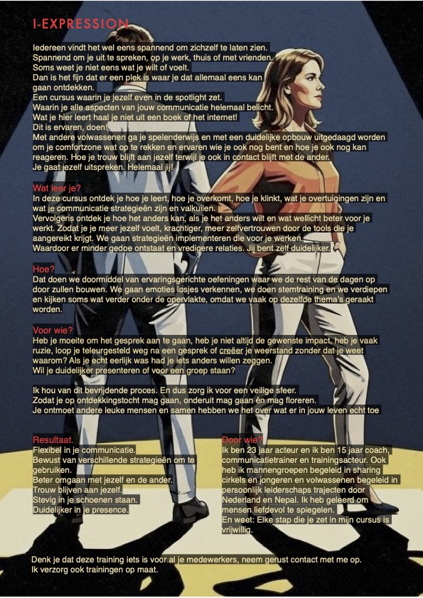 Iedereen vindt het wel eens spannend om zichzelf te laten zien. Spannend om je uit te spreken, op je werk, thuis of met vrienden. Soms weet je niet eens wat je wilt of voelt. Dan is het fijn dat er een plek is waar je dat allemaal eens kan gaan ontdekken. Een cursus waarin je jezelf even in de spotlight zet. Waarin je alle aspecten van jouw communicatie helemaal belicht.